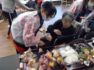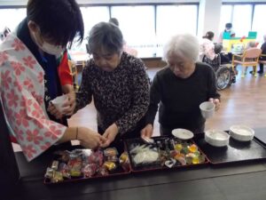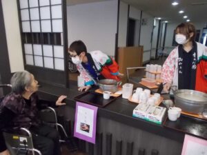 また、甘酒やお汁粉、お菓子が振舞われました。お汁粉の中には白玉が入っています。ご利用者様にお手伝いいただいた手作りの白玉です。
