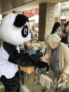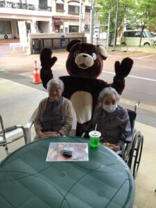飲み物とポテトをいただいていると…くまさん🐻とぱんださん🐼がきてくださりました。ご利用者様も笑顔で握手をしていました。